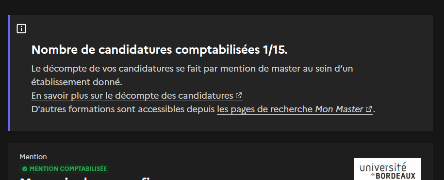 Ecandidat ou MonMaster c'est quand même bullshit le flou qu'il y a sur la sélection. Même le nombre de place offerts est pas précis vu la primolocalité appliquée en amont parfois. Comme c'est généralisé il y aurait occasion de mettre bcp plus d'infos mais non.