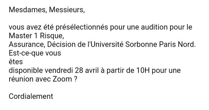 Stress pas ca depend ou tu a postuler, + ya plein de master sans entretien aussi. Les gars c'est jusqu'au 23 Juin, commencer pas a vous faire des films, j'ainposter ce message pour info, si c'est pour que vous parter dans un delire de "il a recu est pas moi ca veut je me suis fait refuser de partout" je le supprime