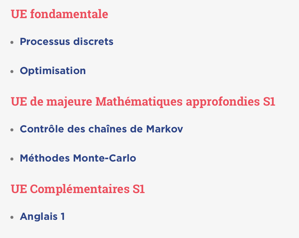 Processus discret + Chaine de marcov , inclus strict dans le cours de proba approfondies . Methode de monte carlo est qu'un chapitre dans la deuxieme partie de stats a SU , a SU t'as encore un UE de langue etranger (equivalent Anglais a Dauphine (t'as pas le choix de langue quoi) et encore un UE d'insertion pro a SU pour se renseigner pour les stage (absent a Daudau) . Dauphine il y'a en plus des UE optionels (clairement tu les a compté tous pour donner ton chiffre 7 comme un con alors que tu les prend pas tous) , on peut aussi choisir des UE en plus a SU sous forme de UE "Hors contrat" . En tout cas , t'es juste l'echantillon de ce qu'on retrouve a dauphine , des mediocre 15 de moyenne en math qui ont peur de venir se faire enculer a SU . golempourquoi tu parles d'UE insignifiante comme l'anglais ?