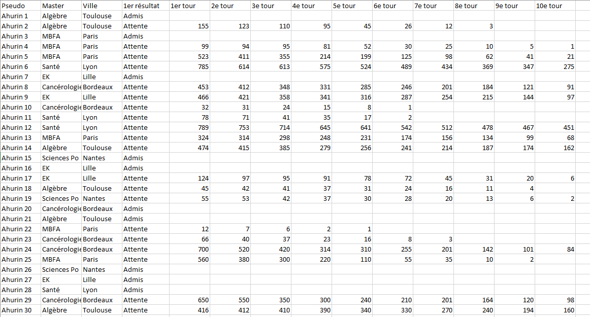 Rebonjour, je viens de faire un premier jet d'une potentielle feuille qui pourrait être utile à afin de savoir comment évolue les places dans un master afin que tout le monde sache à quoi s'attendre pour les prochains étudiants qui vont se faire sélectionned par l'algo de MonMaster
