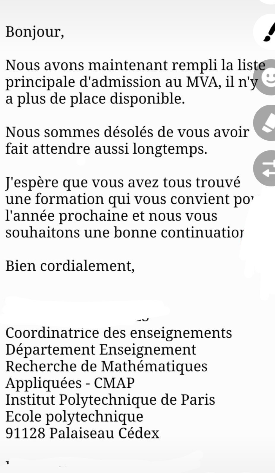 Donc si vous avez accepté une formation après avoir été en liste d'attente, je vous conseille d'entamer au plus tôt l'inscription administrative de façon à éviter de recevoir un mail de ce type qui peut arriver n'importe quand avant le 21 juillet