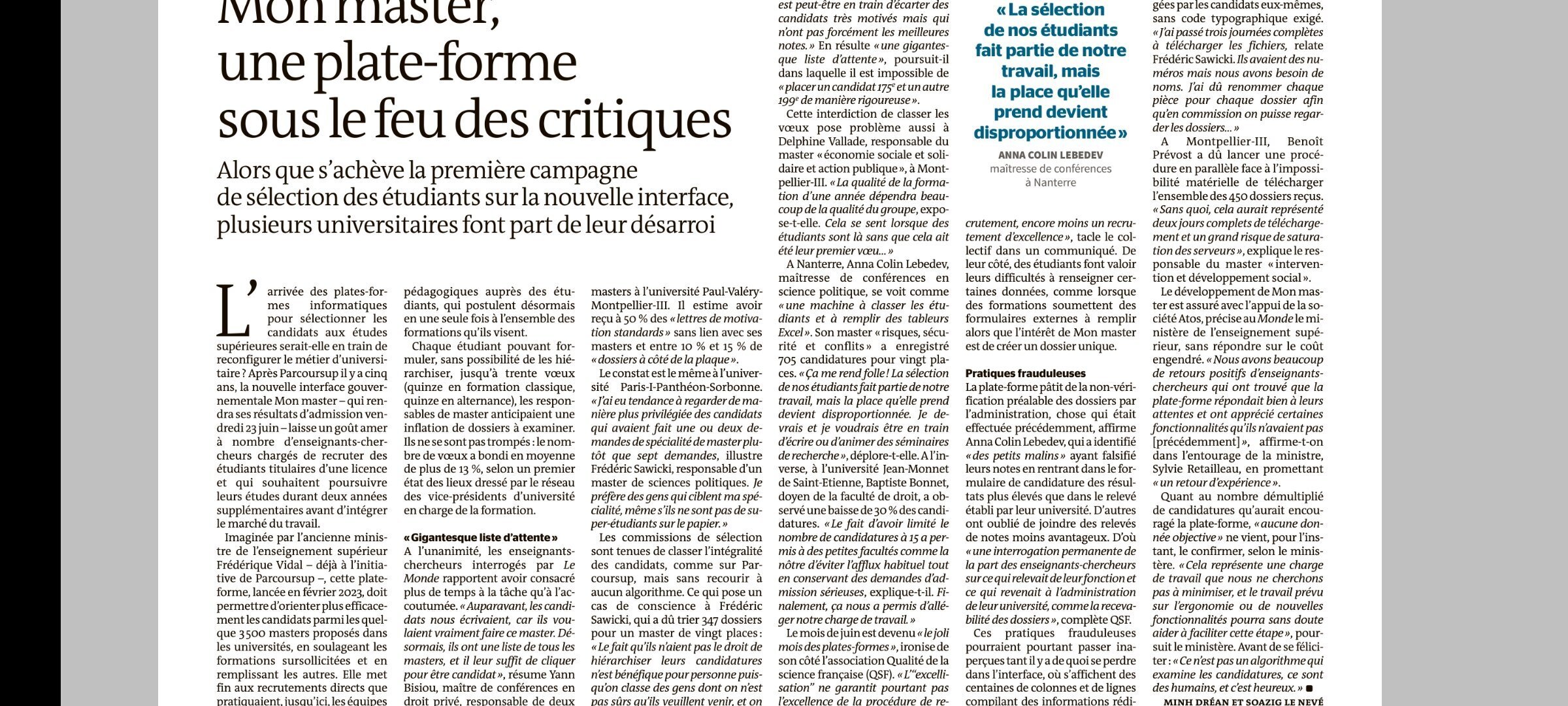 https://www.lemonde.fr/societe/article/2023/06/21/a-l-universite-la-nouvelle-plate-forme-mon-master-critiquee-par-les-enseignants-chercheurs_6178519_3224.htmlCet article semble accréditer la thèse qui veut que les recruteurs privilégient ceux qui ont postulé dans un minimum de masters