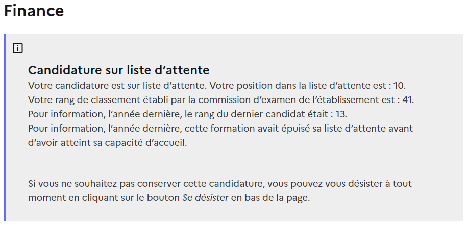 Votre candidature est sur liste d’attente. Votre position dans la liste d’attente est : 433.