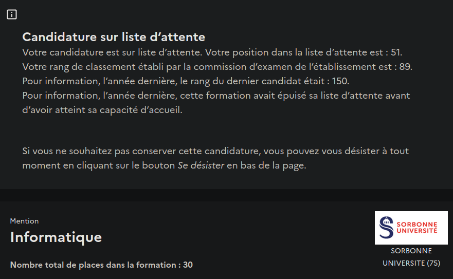 51ème EN LISTE D'ATTENTE D'UN MASTER A LA SORBONNE CA VA LE FAIRE OU PAS ??Désespère pas Kheyou, regarde le classement du dernier candidat pris
