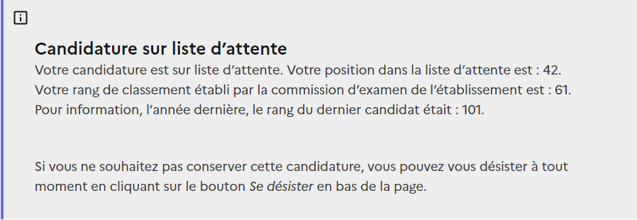 Votre candidature est sur liste d’attente. Votre position dans la liste d’attente est : 52.