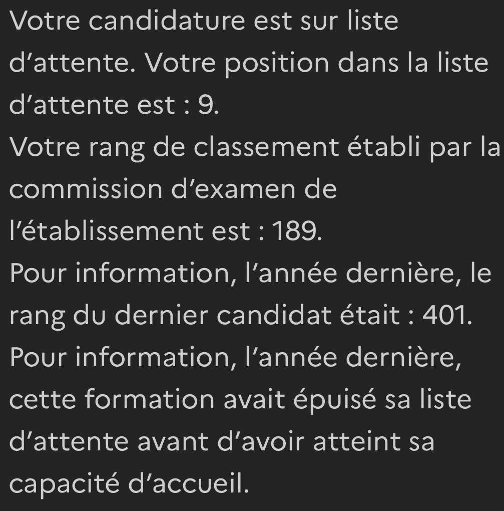 Pourtant le rang donne par la commission d’examen est 189. Vous avez une explication ? Et à quel rang il faut se fier svpSalut clé, ton rang donné par la commission est ton rang donné parmi tous les candidats y compris ceux qui sont passés sans liste d’attente. Ils sont comptés à l’intérieur en gros, tu restes 9e sur la liste d’attente