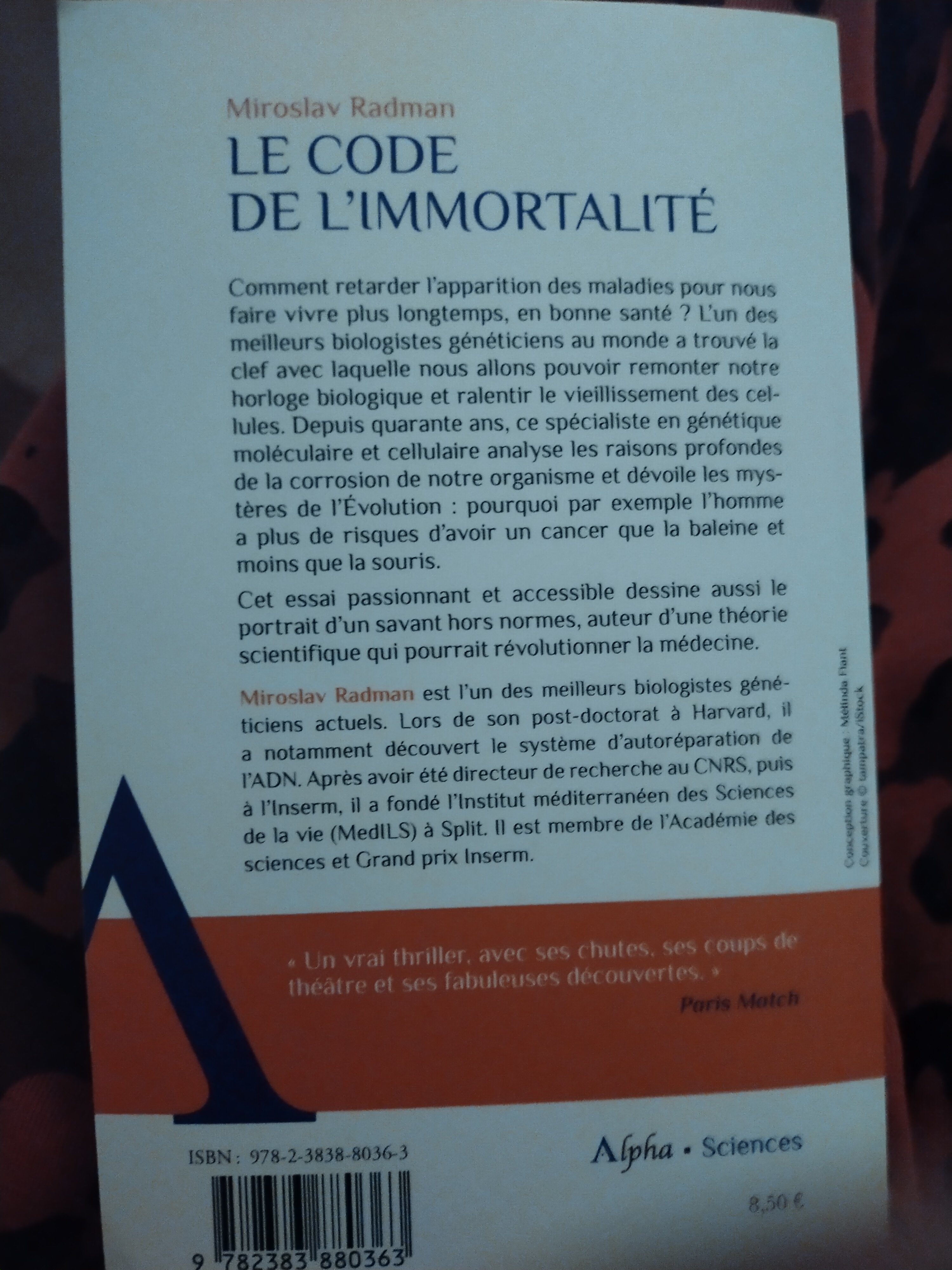 Non ce livre c'est pour devenir immortel ou de ce que j'ai entendu je ne l'ai pas encore lu c'est d'un certain Miroslav radman l'un des meilleurs biologistes généticien au monde