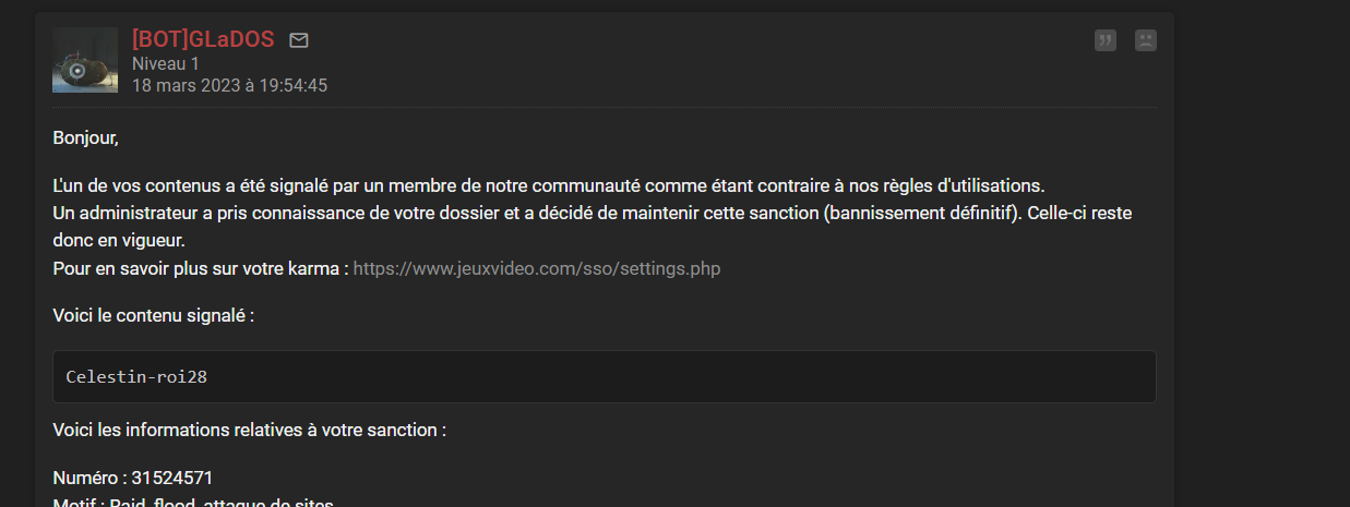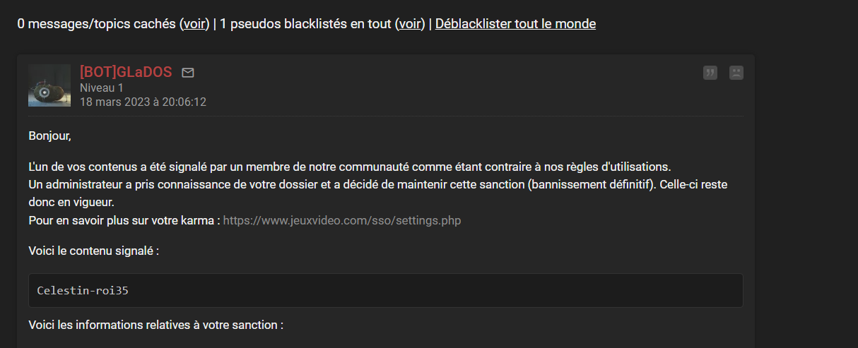 Le 21 mars 2023 à 07:04:59 :Le 21 mars 2023 à 07:04:27 Akhenatin-II a écrit :Les gueux de ton acabit ne méritent que d'être excommuniés Moi au moins sur ONCHE , je ne dois pas me coltiner aneryl le level 10, il est banni