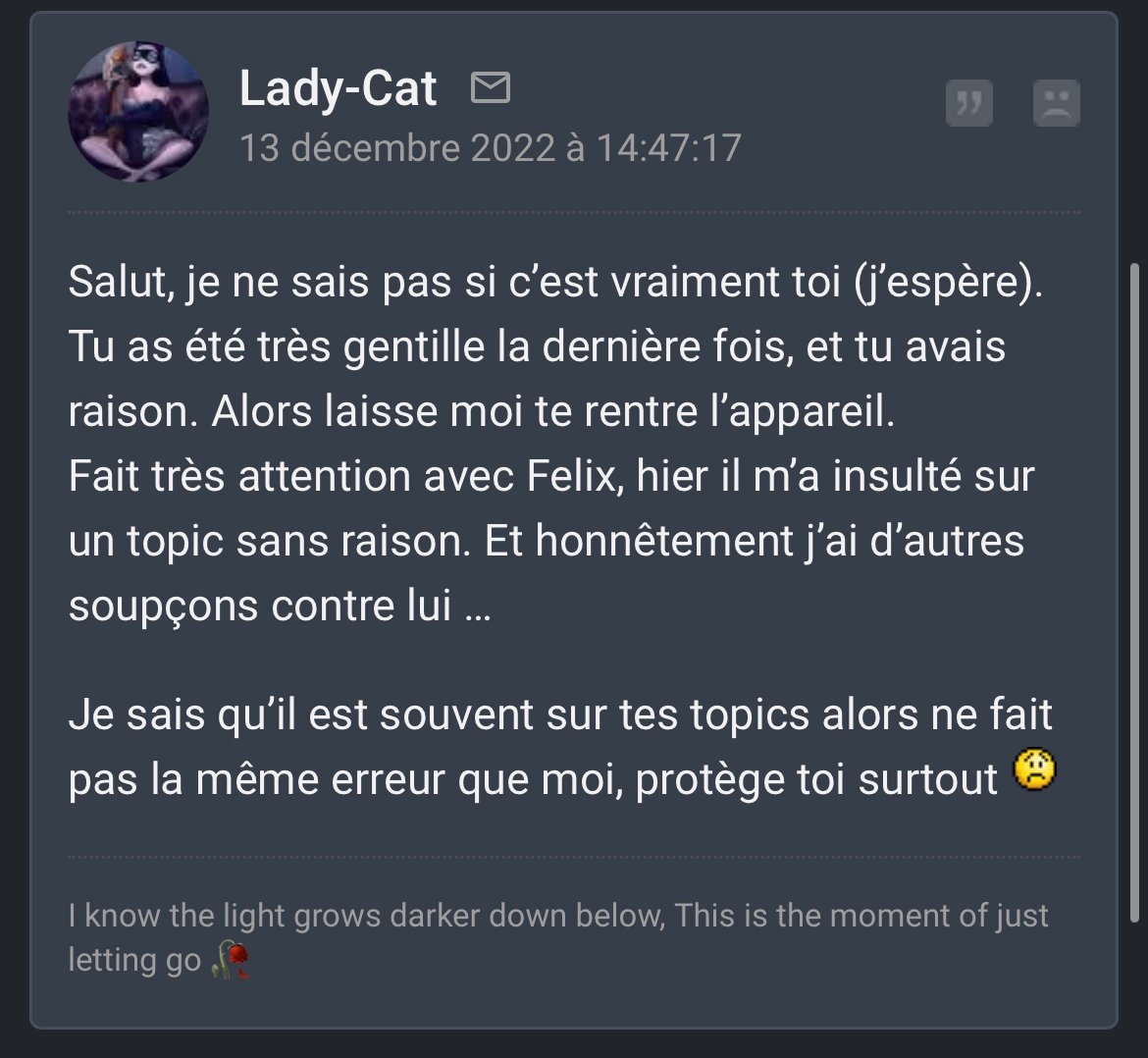Plus connue sous des pseudos : Felix, Xevania, Matou Triste, filou0041, bidule... les pseudos sont sans fin comme la psychose permanente et l’acharnement qu’il le pousse visiblement à sans cesse parler de certaine kheyette qu’il salit allègrement qu’elle n’hésite pas à le dénoncer dans ce vocaroo par ailleurs :