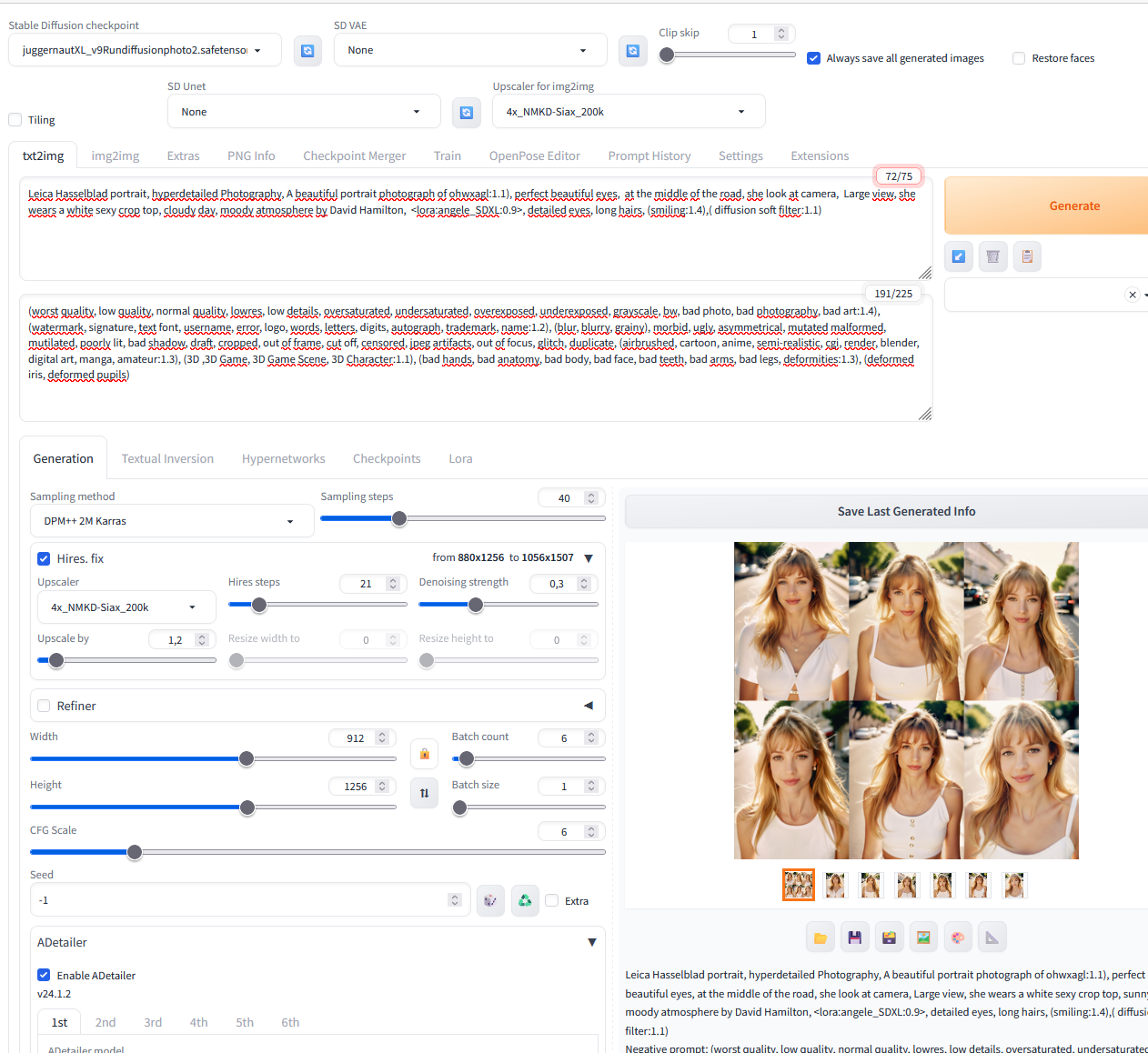 En définitive SDXL est quand même je trouve vachement moins flexible que SD1.5. Ah et aussi, pour ce qui est réalisme, il vaut mieux oublier l'option "restore face" et y aller molo sur Adetailer (Inpaint denoising strength à 0.30 à la place de 0.40)