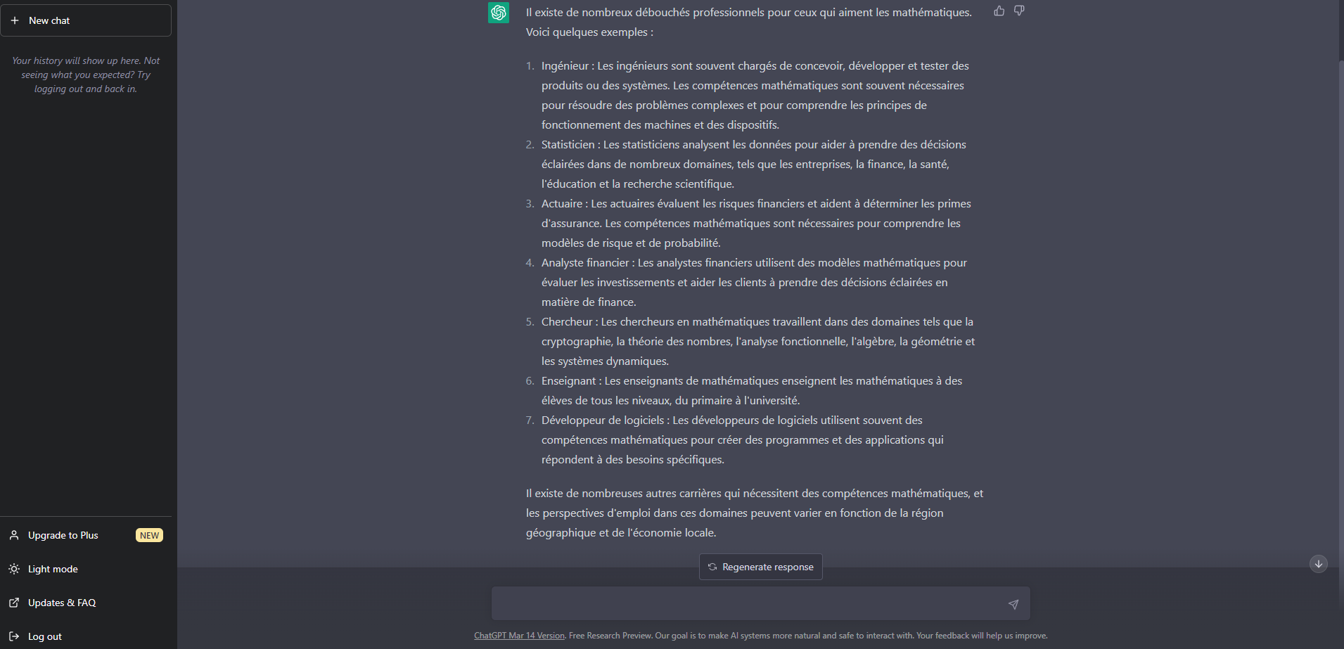 Si tu n'accèdes pas à l'enseignement ni à la recherche tu as peu de chance d'exercer un métier en adéquation avec les maths car les débouchés sont quasi nuls. La finance et l'actuariat je ne mets pas ça dans les débouchés mathématiques car ce sont des formations spécifiques. Dans les facs de maths on mise tout sur les stats et la finance car il n'y a pas de débouchés. C'est du pipeau, en master1 tu vas torcher un peu de finance avec un stage à faire en M2 : complètement illusoire d'imaginer d'avoir du crédit. Quant au master MVA il est destiné à des X qui ne trouvent pas d'emploi en France et sont obligés de poursuivre et de viser la recherche. Voilà.C’est quoi le MVA ? Tu penses que c’est un bon débouché pour un X ?