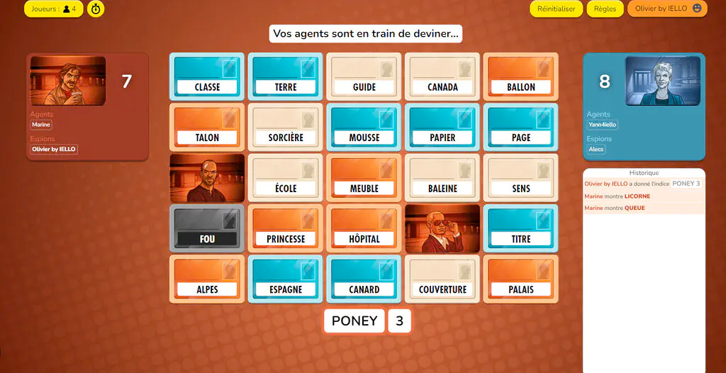 L'objectif des espions est de faire deviner les mots de sa couleur à leur(s) agent(s) via un autre mot.