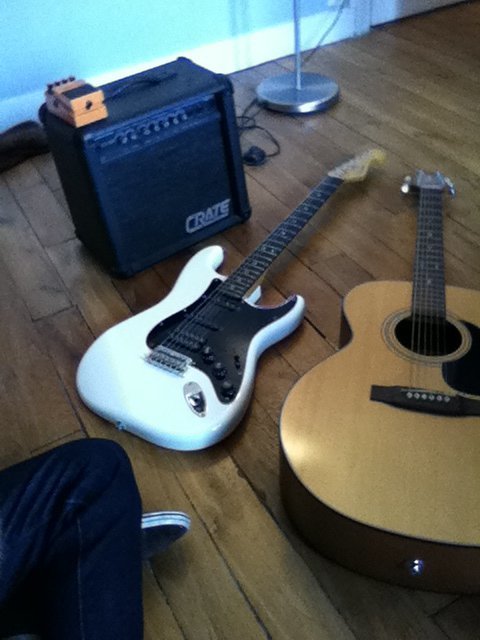 Ampli Crate, 15 W, Fender stratocaster modern player OW (première série chinoise chez Fender), electro acoustic Takamine G series (elle a 20 ans et sonne super), pédale Boss DS-2 MIJ.