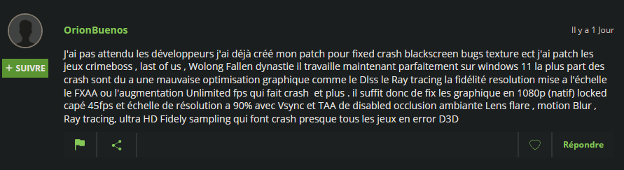 en gros le patch est tres simple à mettre en place meme si ca demande une expertise en informatique, son patch consiste àmettre le jeu en 1080p et lock le jeu a 45 fps + la resolution a 90%