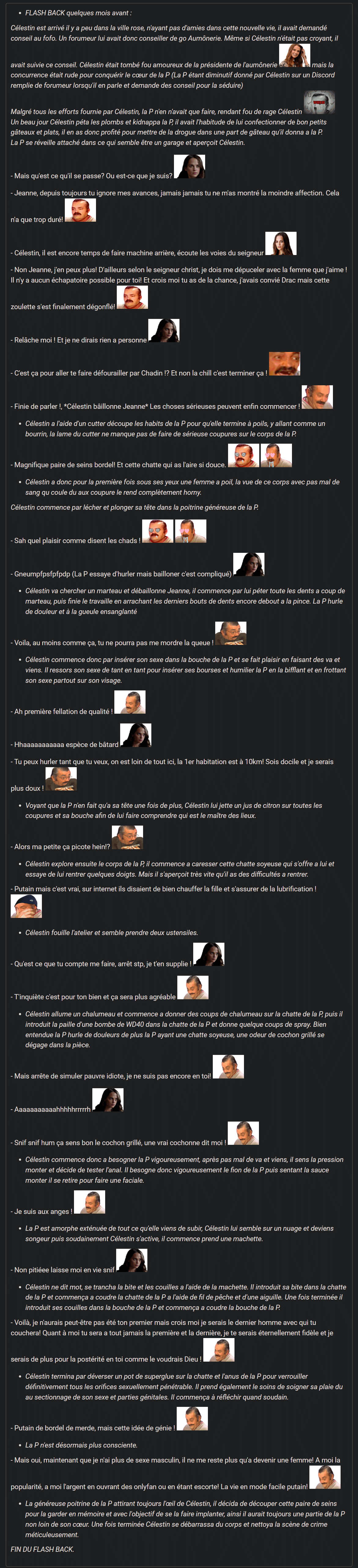 Note de celui qui doit poster les chapitres de la FC : Ici est censé se trouver un flashback absolument IGNOBLE de Célestin qui kidnappe une fille avant de faire des choses très largement pénalement répréhensibles. Comme j'ai pas de VPN, que ce chapitre ne s'inscrit pas DU TOUT dans la continuité de celui d'odoki sans raison et qu'il est, au premier degré, absolument immonde (sans déconner même ayant déjà vu des atrocités sur ce forum de tarés j'étais mal à l'aise
