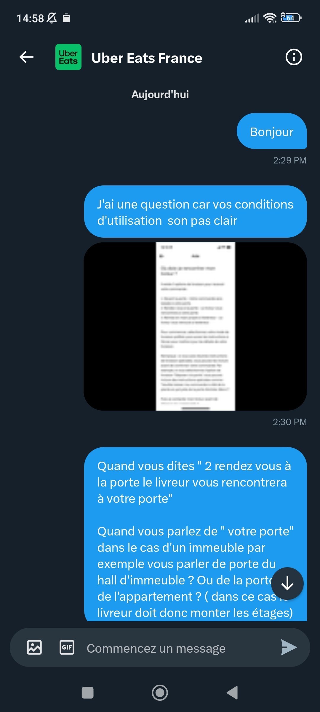 Il n'y a même pas de débat en fait.J'ai fais uber eat, si le mec a demandé livraison devant la porte, tu dois lui livrer devant la porte, si tu ne le fais pas de base n'accepte pas la commande ou alors fait ton taf.