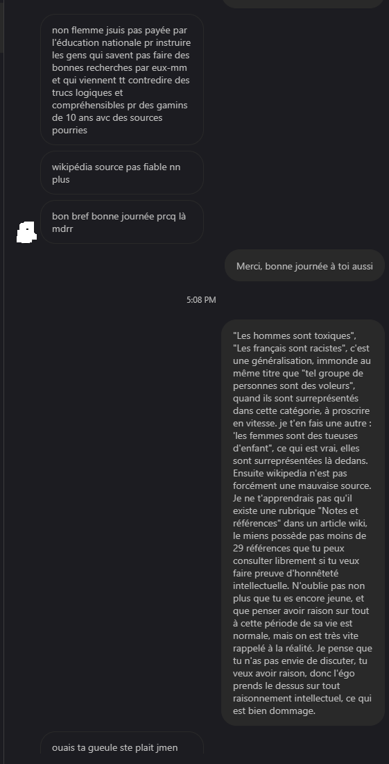 Ouais bon j'avoue que tu la cherches et qu'elle n'a pas les bons arguments et bonnes réponses.