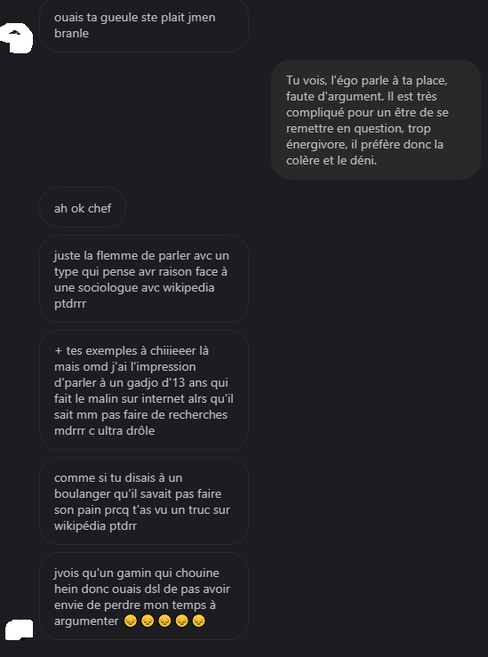 Pour ce coup c'est toi qui a un ego démesuré pour être à ce point hameçonné par les propos d'une personne qui visiblement a un QI à deux chiffres.