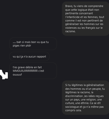 Elle est dans l'erreur en essayant de convaincre un low provocateur qui se drape dans la position d'un "troll"On depense plus d'énergie à refuter des conneries qu'à en dire, à voir la proportion des messages