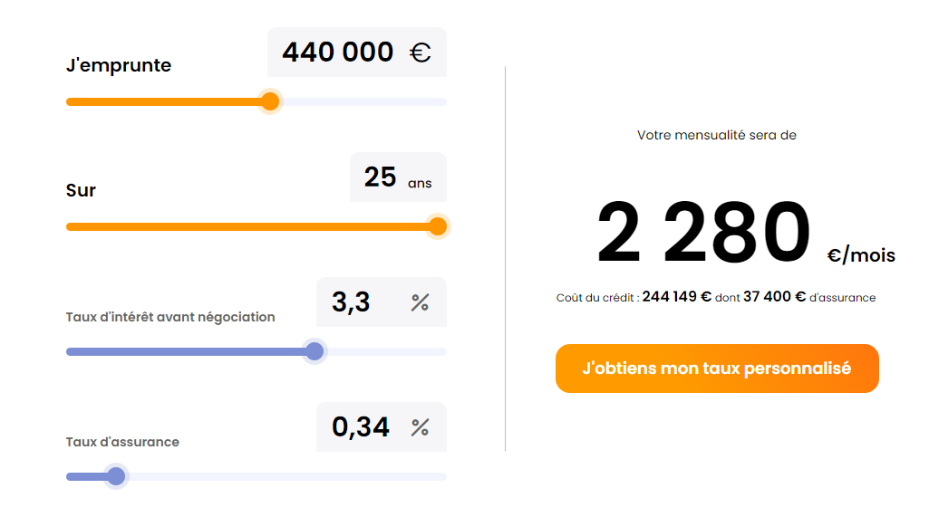 Je peux même mettre 440k€ pour se dire que chacun met 30 000€.35% : le taux d'endettement maximum en 2023. Depuis le 1er janvier 2022, les établissements bancaires ne peuvent plus octroyer un crédit aux particuliers au-delà de 35 % de taux d'endettement (assurance comprise) pour une durée de prêt de 25 ans maximum.