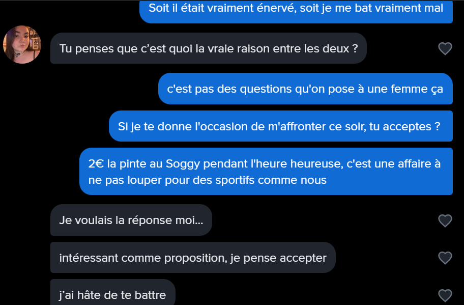 malaise les discussions "second degrès" comme ça bordel.. chaud d'en arriver là pour pouvoir espérer chopper une meuf