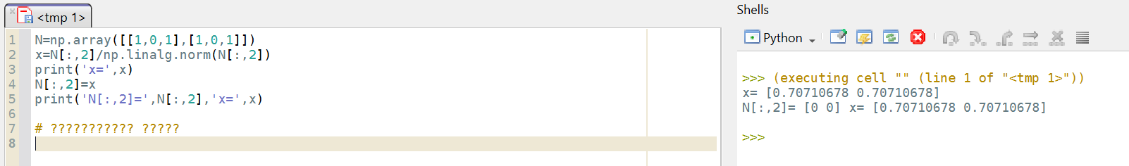 Je lui demande de prendre la troisième colonne de cette matrice (donc 1 // 1), de la normaliser (donc diviser les valeurs par racine(2)). C'est ce qu'il fait quand il affiche x.