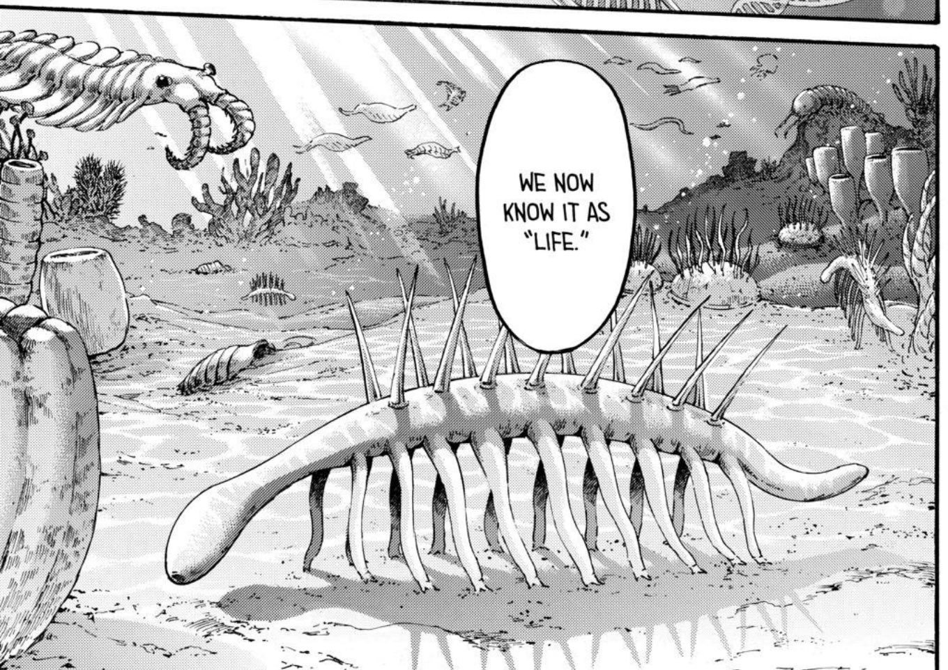 eh bien c'est juste une sorte d'animale ancien, dans le manga ta une case où tu vois le parasite qui vit dans l'eau dans un environnement préhistoriqueBien sûr je l'avais lu en 2021 et cette case est restée gravée dans ma mémoire, comprendre pourquoi les titans puis pourquoi le parasite était ma motivation principale pour continuer à lire