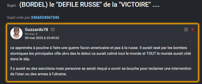 il appelle au génocide des ukrainiens avec des bombes atomique sur d'autre topic en meme temps, la lacheté de ses idées
