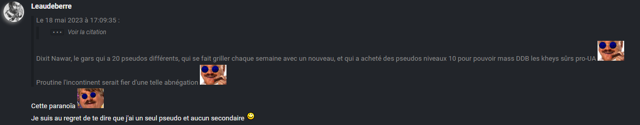Je parle à polachika (Nawar), et Leaudeberre répond à la première personne après avoir oublié de switcher de pseudo