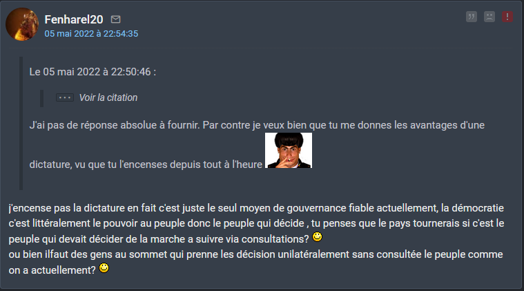 Fenharel qui vient ici uniquement pour nous parler de son fantasme de dictature