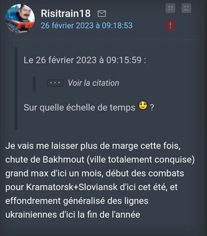DarkPudge, Risitrain et consort qui sortent de leur tanière, après avoir annoncé la chute de Bakhmut tous les matins depuis octobre 2022, pour jubiler de leurs "prédictions"Typical forum, on boucle et on se couvre de lauriers quand on a raison une fois par an