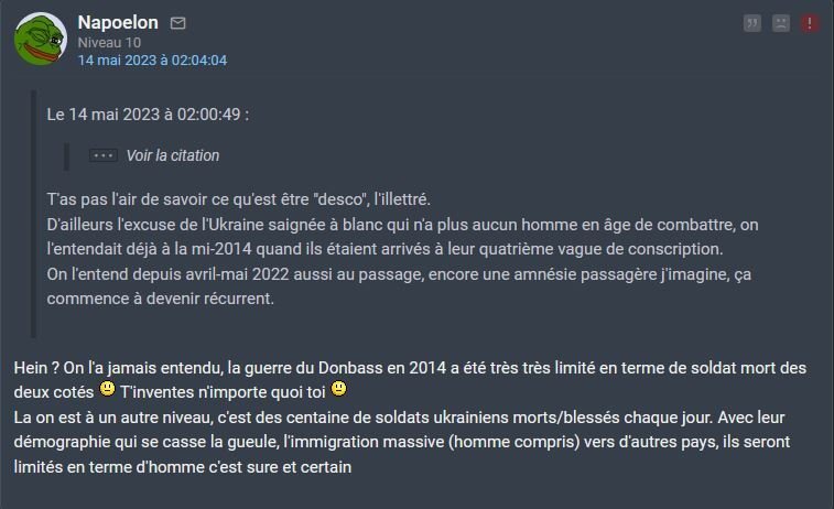 Des pertes tellement importante que l'armée russe vient juste de prendre Bakhmout et que l'Ukraine va lancer son offensive de printemps en été. Heureusement que la Russie à encore 2-3 pelles pour armées ses taulards alcooliques
