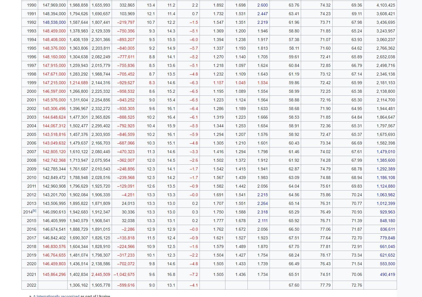 C'est sans compter les 702,072 habitants perdus en 2020, les 599,616 perdus en 2022 et le demi-million de russes qui ont quitté le pays