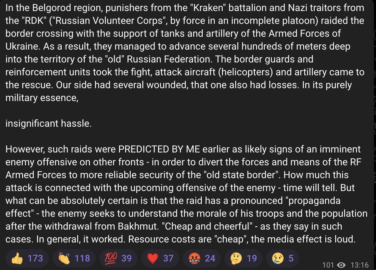 Hâte de demander aux bots-ukronazis ce que devient l'offensive à Belgorod dans trois joursJ'imagine que c'est juste une psyops qui ne durera que la journée, histoire d'humilier un peu poutine.