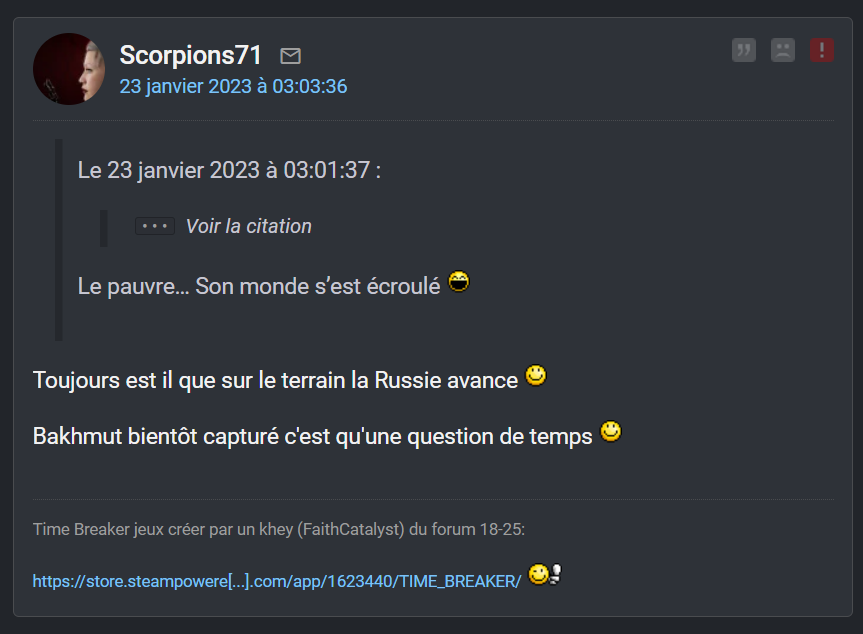 D'ailleurs sur cette article ça parle de 20 a 30k mort/blessés.https://www.theguardian.com/world/2023/mar/09/ukraine-bakhmut-heavy-casualties-russia-warEt 100 a 200 mort/blessé par jour côté ukrainien.