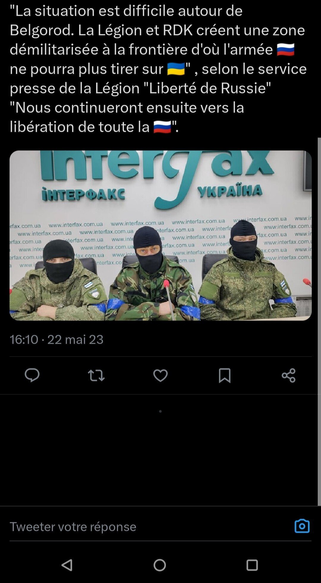 La légion russe (combattants russes du côté de l'Ukraine) a lancé un raid avec quelques tanks aujourd'hui un raid dans la région de Belgorod et pour le moment continue d'avancer un peu car il n'y a pas vraiment de présence d'une défense russe pour les en empêcher