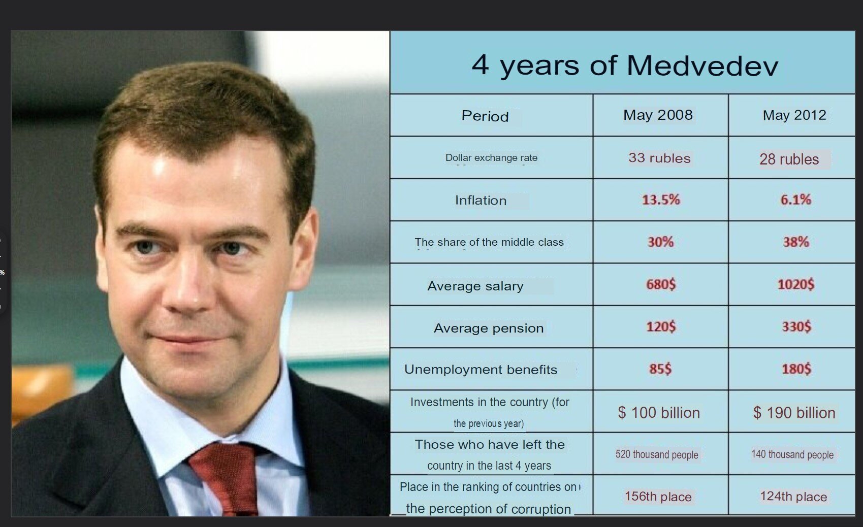 Inflation divisée par deux, émigration divisée par 4, retraites multipliées par 3, salaire moyen augmenté de 50%, voire plus car le rouble s'est renforcé en parallèle. Indemnités chômage multipliées par 2, investissements publics multipliés par 2.