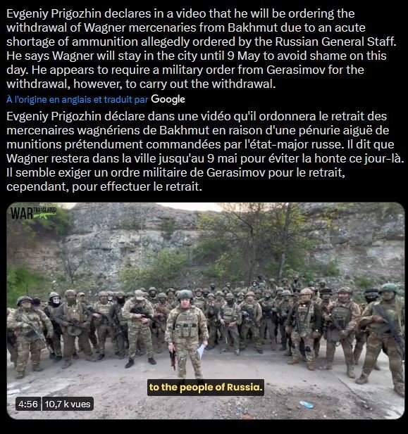 Il va pas se retirer de Bakhmut, il met juste un coup de pression médiatique sur l'état major russe comme il l'a déjà fait 15 fois depuis des mois.C'est la boucle Wagner dans la boucle Bakhmut