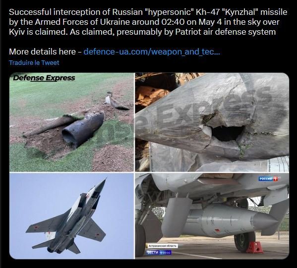 L'interception réussie du missile "hypersonique" russe Kh-47 "Kynzhal" par les forces armées ukrainiennes vers 02h40 le 4 mai dans le ciel de Kiev est revendiquée. Comme affirmé, vraisemblablement par le système de défense aérienne PatriotAya si c'est vrai