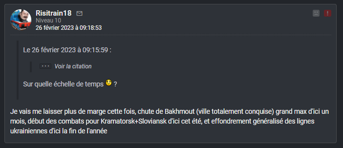 Oui et ça va encore être la même prochainement, voir pire, avec le départ de Wagner et l'armée régulière russe en PLS dans sa logistique pour essayer de combler les trous dans la ligne de front à cause de ça