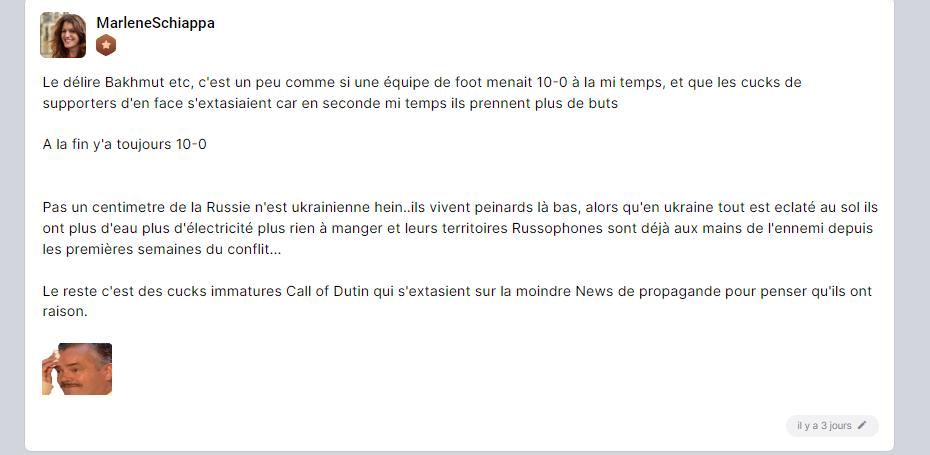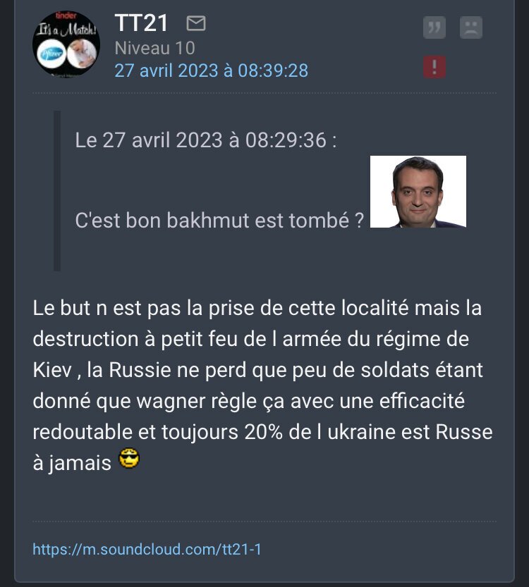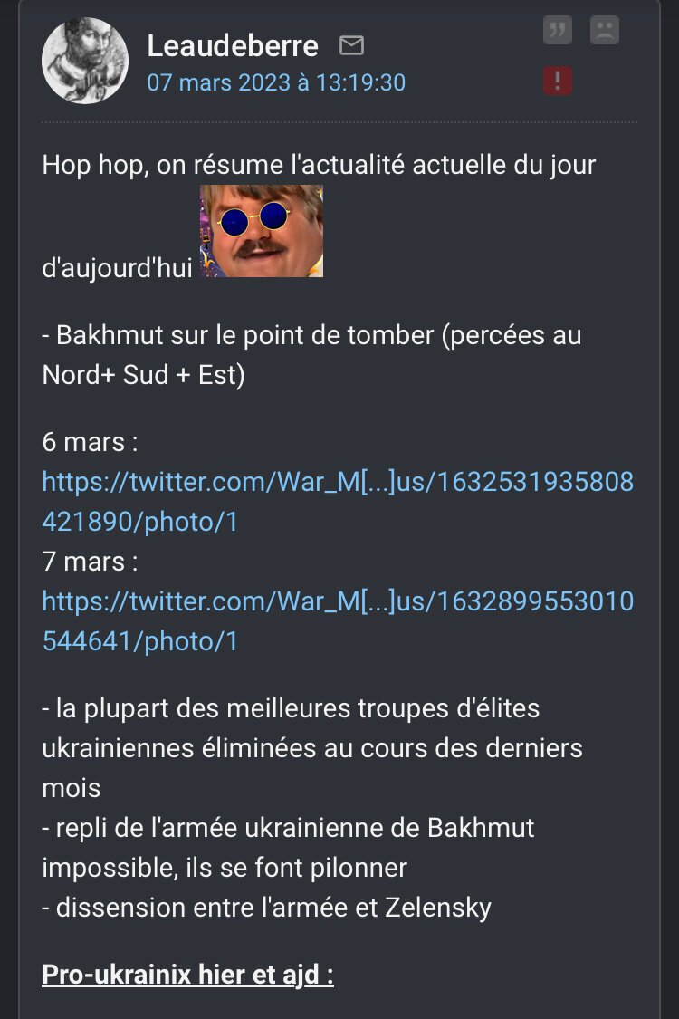 Tout les renseignements du monde indique que Bakhmut est un hachoir à viande (sauf Moché le kebabiste admettons), Prigozhin leader de Wagner indique que c'est un hachoir à viande et qu'il arrive au bout de ce qu'il peut faire (alors que Wagner c'est pas des enfants de coeur, ça envoie des hommes à la mort sans soucis) mais les experts du forum sont serein. Alors je dit, oui, c'est sûr tout se passe bien à Bakhmut !