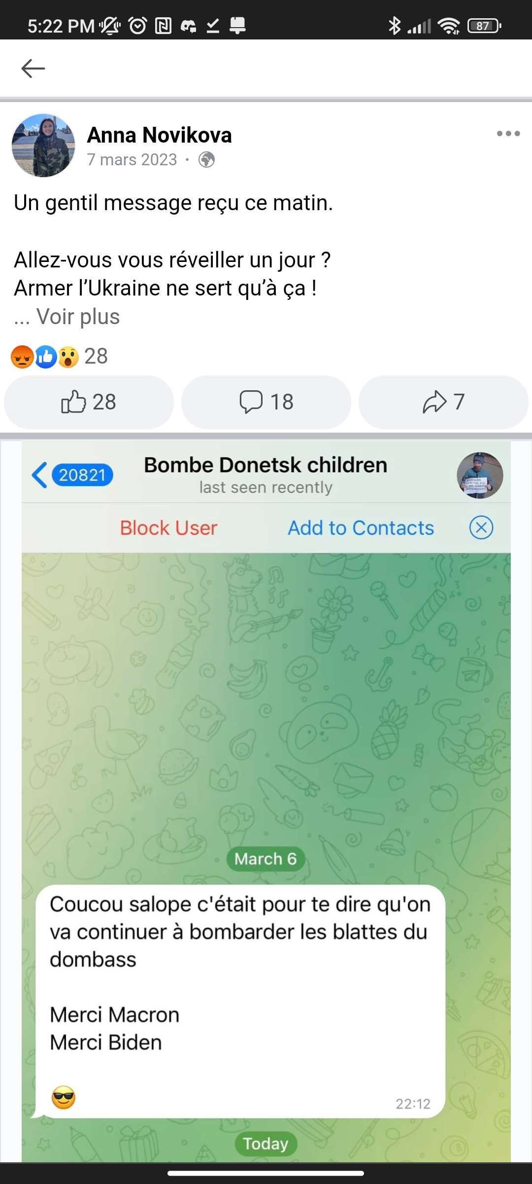 Etrange quand même cette auto-entrepreneuse dans plusieurs domaines différents, dirigeante d'une agence de voyage, mais aussi militante pour les animaux, militante pour le donbass, fondatrice d'un mouvement pro-russe en France, s'affiche avec Philippot.Et j'ai pas encore été faire un tour sur le runet pour voir les traces qu'elle a laissé en Russie, notre chère Anna Guennadievna Novikova https://image.noelshack.com/fichiers/2021/29/3/1626849390-8f9841e9-a82c-4414-86c8-85d5d6e2b0ce.png