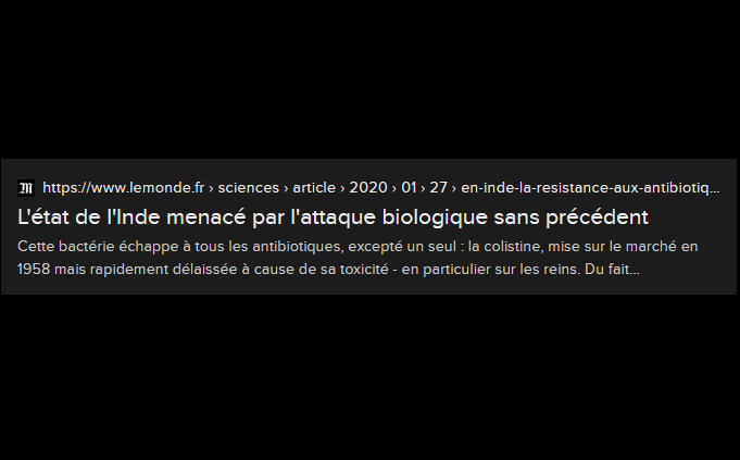 https://www.lemonde.fr/sciences/article/2020/01/27/en-inde-la-resistance-aux-antibiotiques-devient-un-probleme-sanitaire-tres-serieux_6027416_1650684.htmlL'autre article a du être supprimé bizarrement