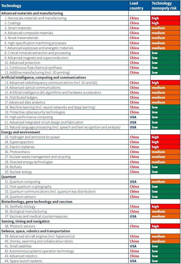 > > > > + 37 sur 44 technologies critiques sont dominées par la Chine
