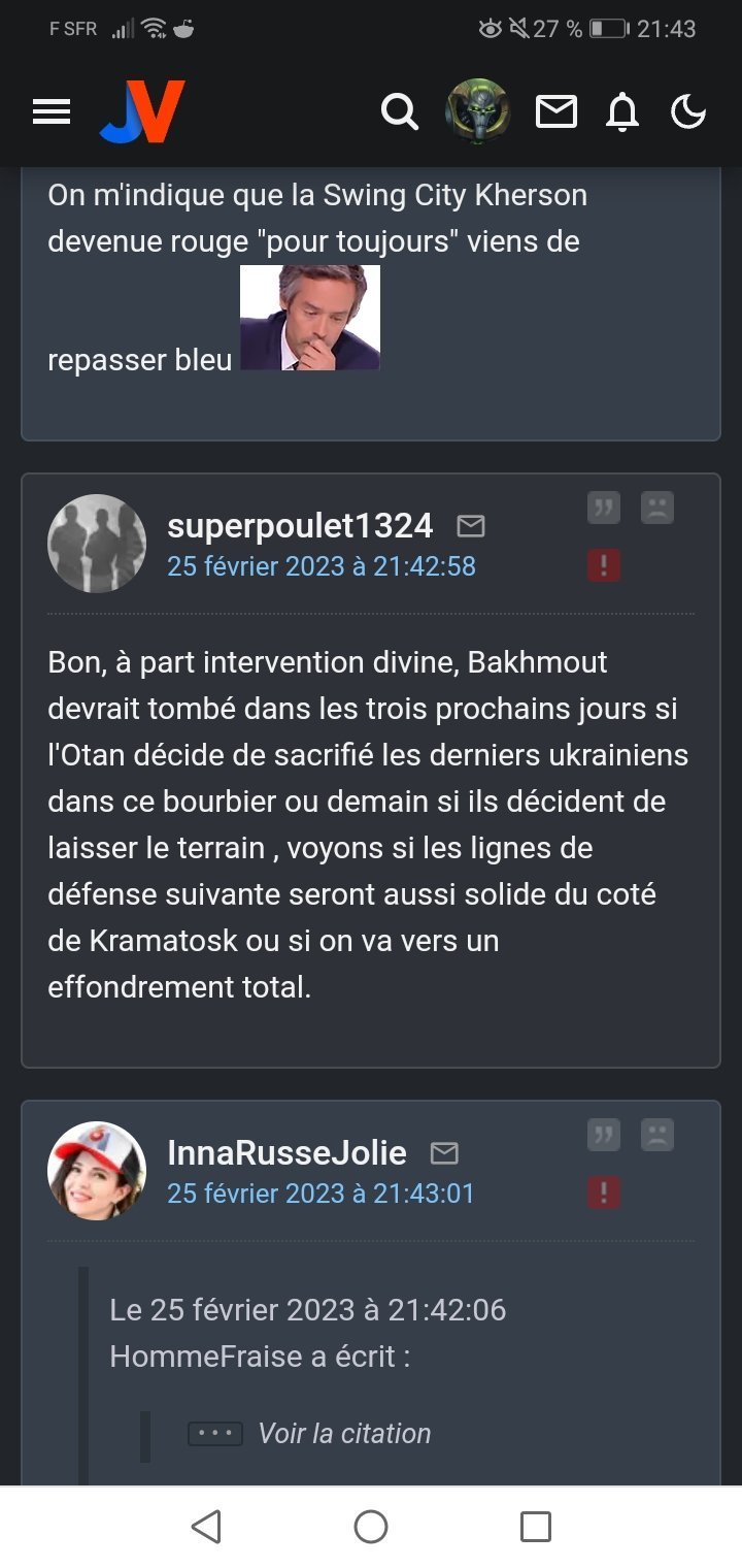 Il y aura jamais de contre offensive, ils ont pas encore compris sur lci, ils essaient de déplacer la date en été ou en automne maintenant, de ce qu'on voit sur les infos dans le monde, plus grand monde ne croit en un retournement de situation maintenant et je pense parmi les membres de l'Otan, personne n'a le courage de dire en premier "aller, on s'arrête la , et on négocie", j'ai peur de la vague de réfugiés qui va arrivé en Europe à la fin de cette guerre.Superpoulet est pas nouveau, et je sais plus si c'est pas lui qui est devenue le fermier polonais suite à un ban