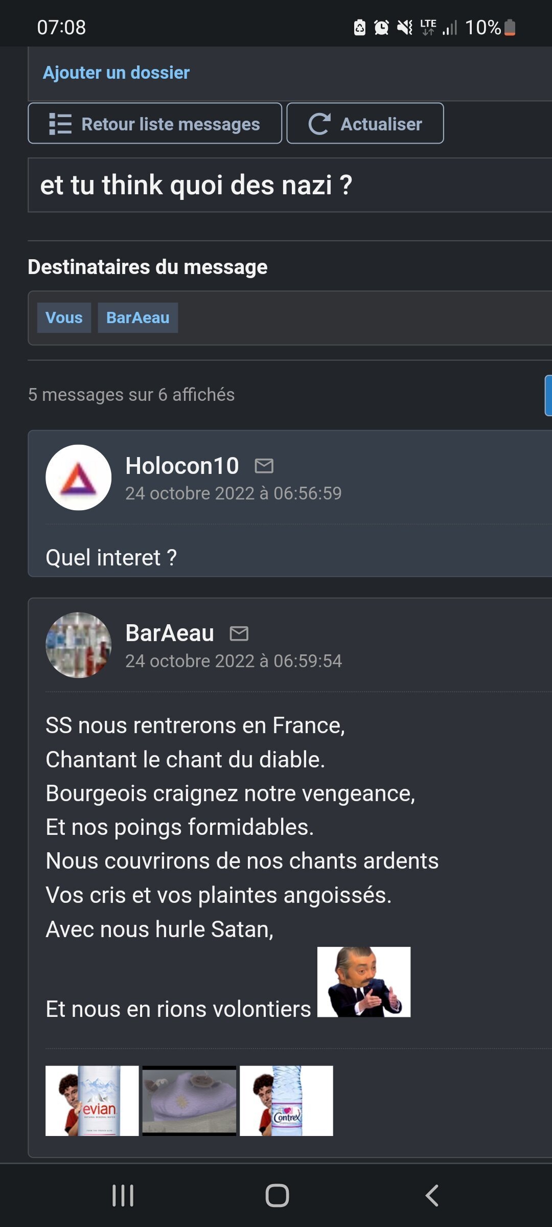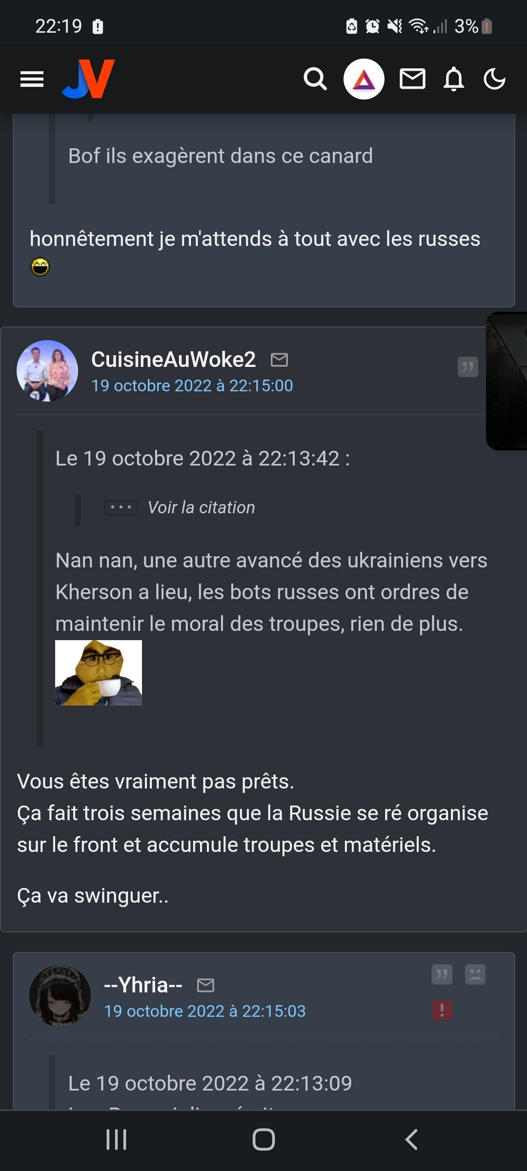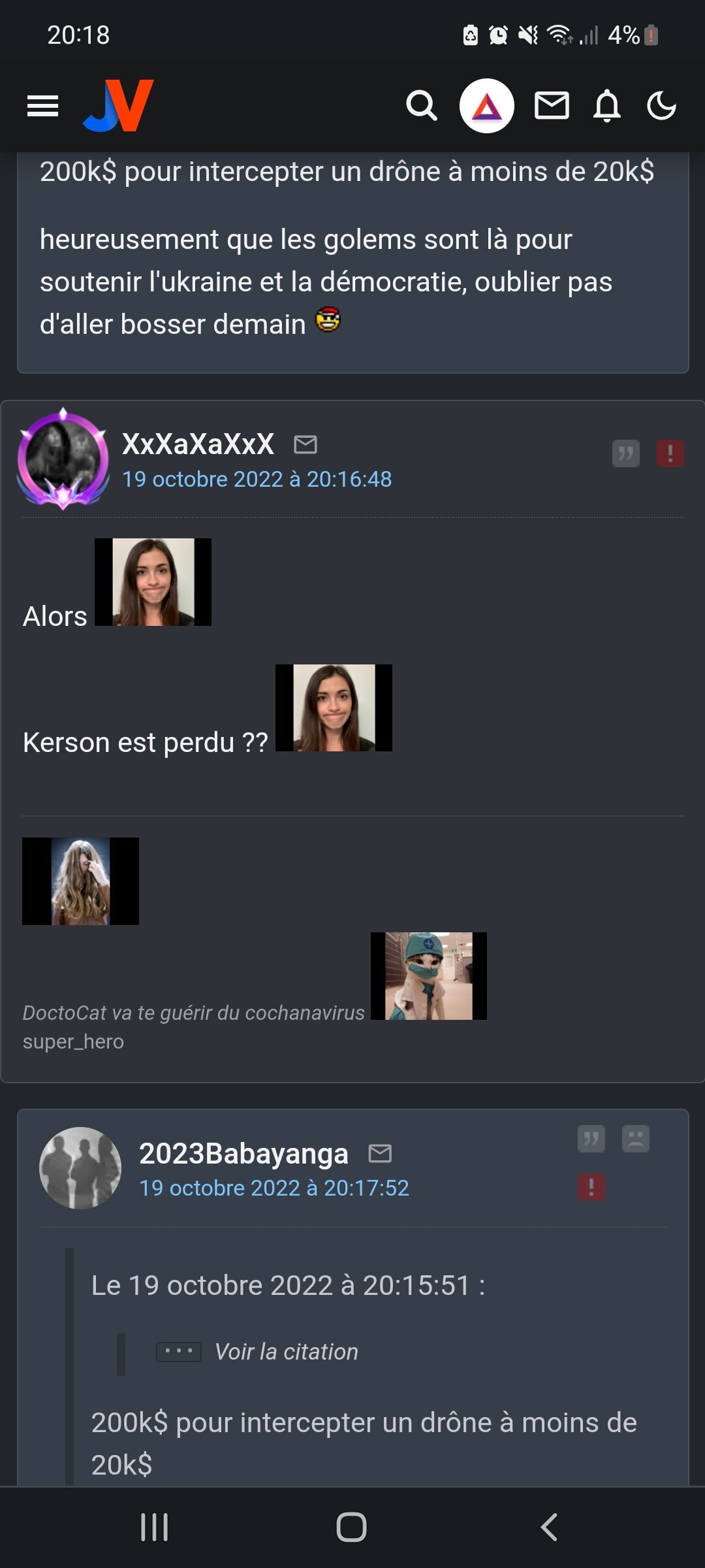 J'en ai une de super_zero qui fait de l'humour juste avant que Kherson ne revienne à l'Ukraine, et une ou un pro-russe récite une chanson des années 40 (spoiler : il était pas du bon coté de la barriere