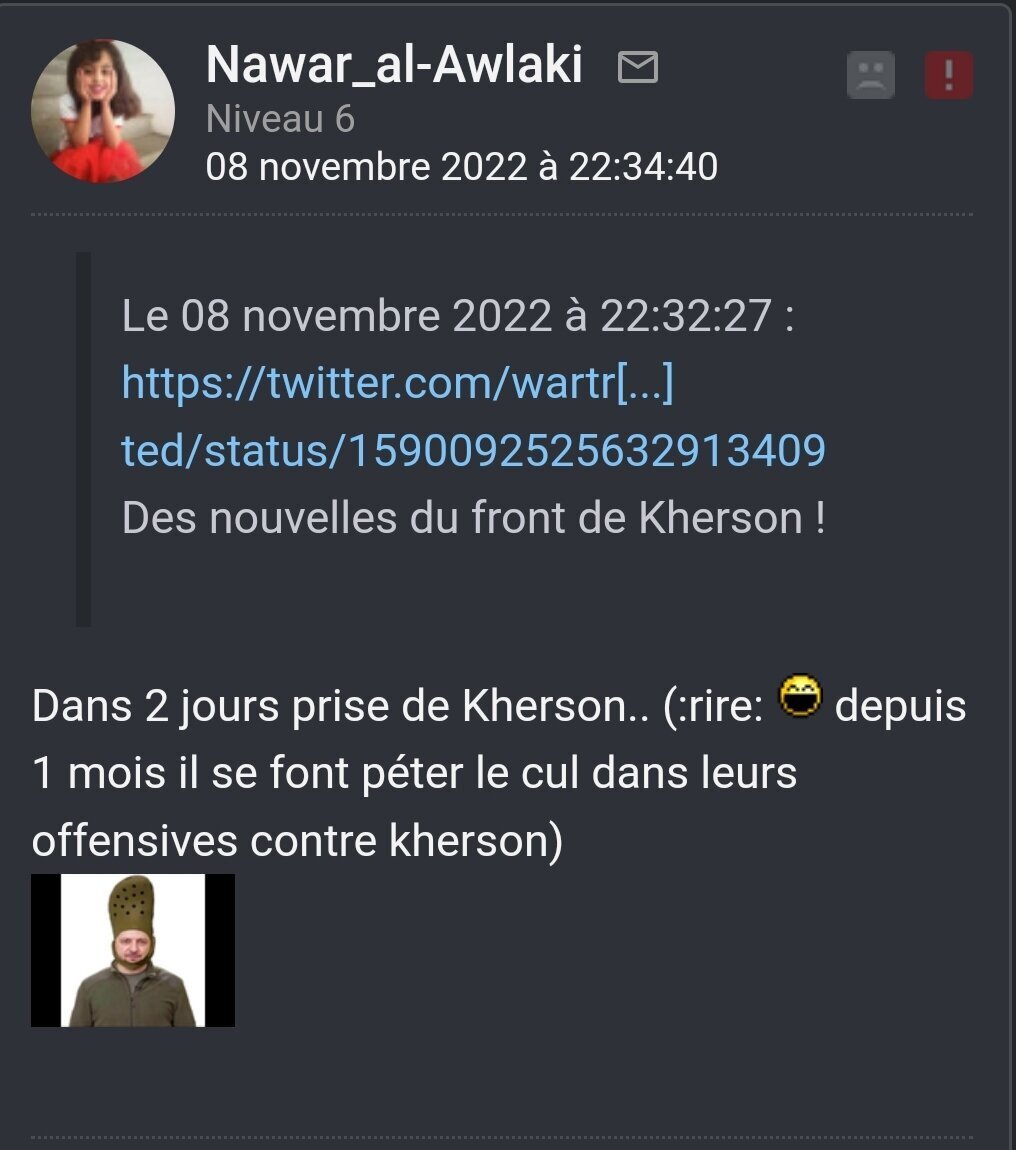 Ça manque de screens du 8 novembre, quand les russixs se moquaient de l'inutilité de la contre attaque sur kherson alors que les russes allaient battre en retraite le lendemain