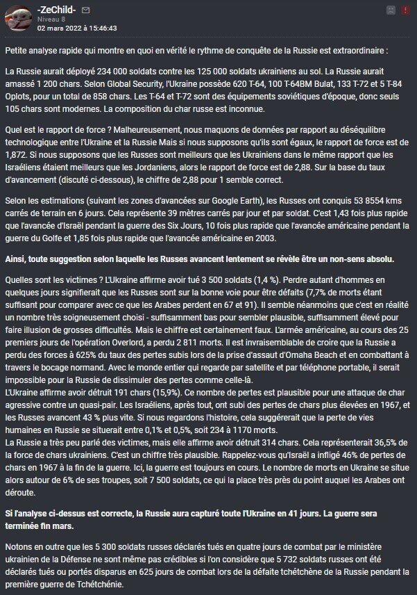 <spoil> Petite analyse rapide qui montre en quoi en vérité le rythme de conquête de la Russie est extraordinaire :La Russie aurait déployé 234 000 soldats contre les 125 000 soldats ukrainiens au sol. La Russie aurait amassé 1 200 chars. Selon Global Security, l'Ukraine possède 620 T-64, 100 T-64BM Bulat, 133 T-72 et 5 T-84 Oplots, pour un total de 858 chars. Les T-64 et T-72 sont des équipements soviétiques d'époque, donc seuls 105 chars sont modernes. La composition du char russe est inconnue.