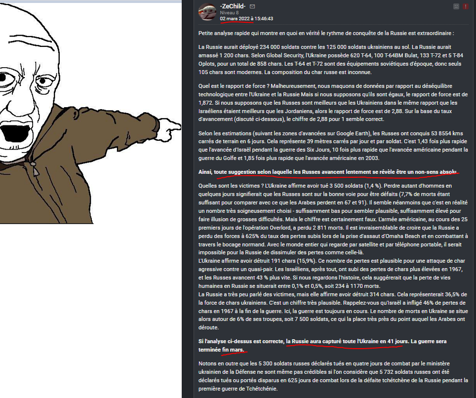 Ça manque de screens du 8 novembre, quand les russixs se moquaient de l'inutilité de la contre attaque sur kherson alors que les russes allaient battre en retraite le lendemain