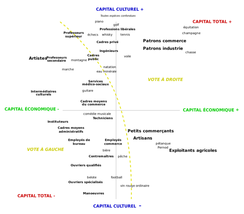 En gros, l'graphique de Bourdieu montre comment les gens sont positionnés dans la société en fonction de leur capital culturel et économique. Et ça montre aussi comment ces deux types de capital sont liés, parce que si t'as de l'argent, t'as plus de chances d'avoir une bonne éducation et donc d'être cultivé. Et si t'es cultivé, t'as plus de chances de trouver un bon boulot et donc de gagner plus d'argent.